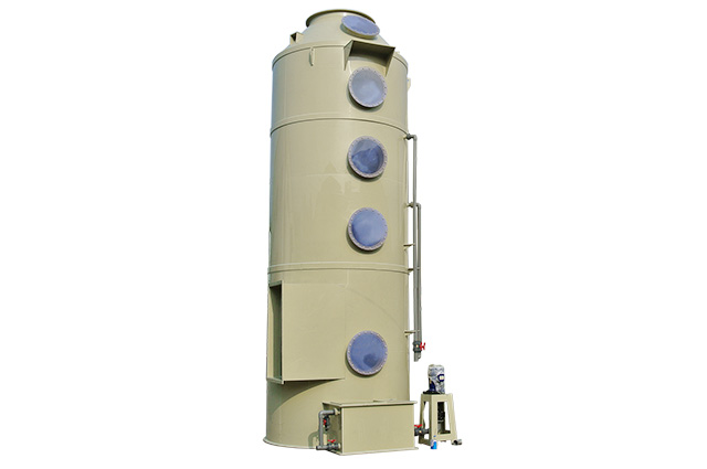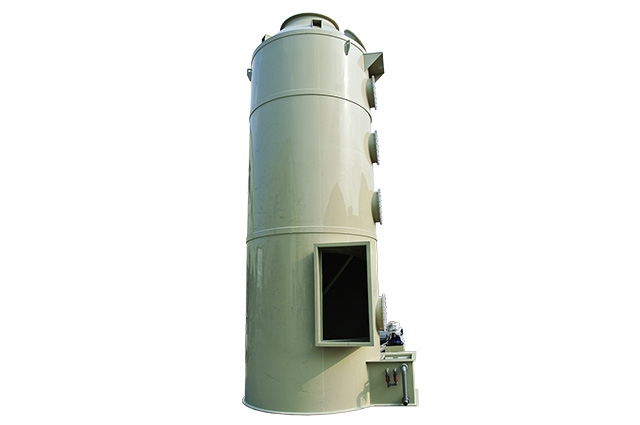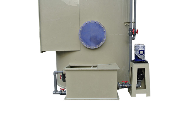 旋流塔是處理粉塵設備,結構與噴淋塔結構同樣,主要是由格柵板填料改變?yōu)樾魅~片、噴淋系統。右下往上,分別是:順時針葉片加噴淋系統;旋流塔內設計多套旋流裝置,經過初級凈化的煙氣旋轉上升,由于旋流裝置設計合理,旋流氣動裝置具有導向和接力作用,利用煙氣自身的動能產生氣動旋流,氣液兩相充分接觸,進行傳質反應,逆時針葉片加噴淋系統,起到一個順逆兩相氣體相沖變化,從而使粉塵流入塔底;大小頭除霧層,起到一個不能讓水份跟隨氣體流出排放。